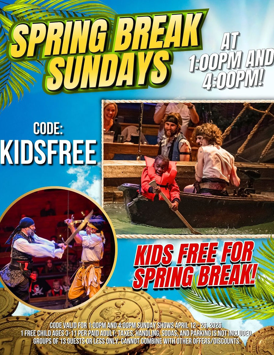 Set aboard an 18th-century Spanish galleon, anchored in a 250,000-gallon indoor lagoon, Pirates Dinner Adventure combines fantasy, fun, and first-class dining. Embrace the dinner theater experience and enjoy your four-course meal while you witness an astonishing display of special effects, death-defying stunts, beautiful aerial artistry, and swashbuckling swordplay, all wrapped up in a classic story of good versus evil. Children and adults of all ages can even take part in the live entertainment. Nightly, up to 150 guests are invited onboard the ship to perform with the crew, making this the “World’s Most Interactive Dinner Show”.