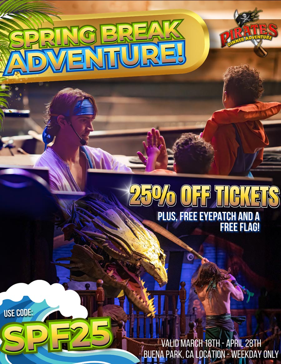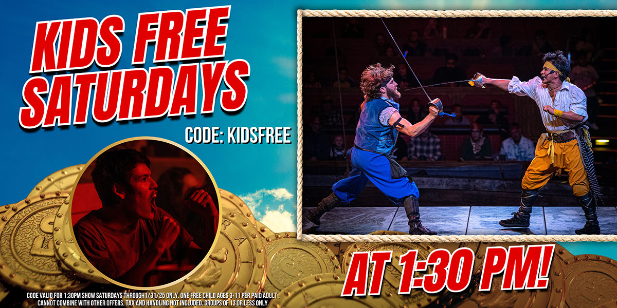 Set aboard an 18th-century Spanish galleon, anchored in a 250,000-gallon indoor lagoon, Pirates Dinner Adventure combines fantasy, fun, and first-class dining. Embrace the dinner theater experience and enjoy your four-course meal while you witness an astonishing display of special effects, death-defying stunts, beautiful aerial artistry, and swashbuckling swordplay, all wrapped up in a classic story of good versus evil. Children and adults of all ages can even take part in the live entertainment. Nightly, up to 150 guests are invited onboard the ship to perform with the crew, making this the “World’s Most Interactive Dinner Show”.